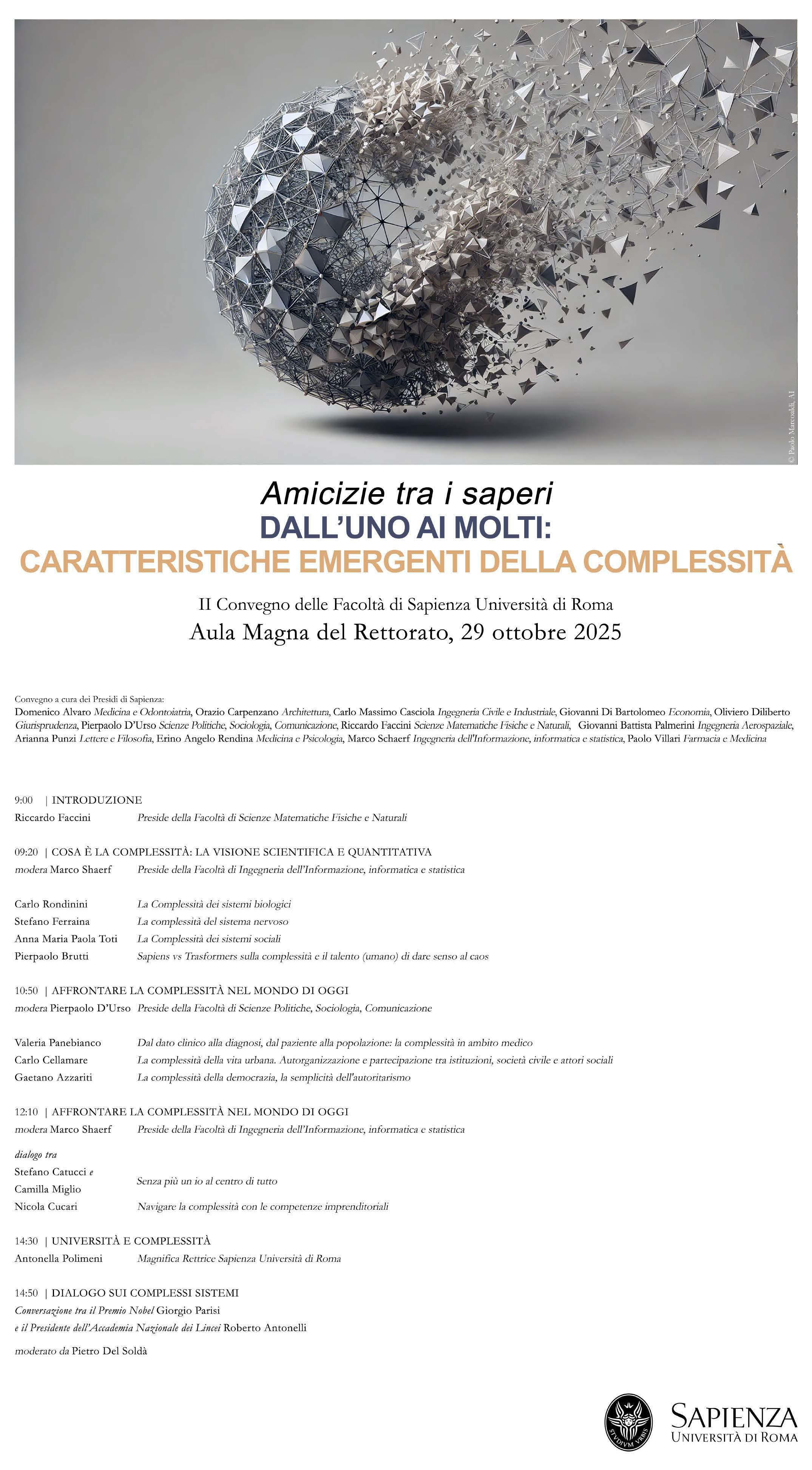 L’iniziativa, a cura dei Presidi di Facoltà di Sapienza, propone una giornata di confronto interdisciplinare dedicata al tema della complessità come chiave di lettura del mondo contemporaneo — dai sistemi biologici e sociali, fino alle dinamiche urbane, economiche e culturali.